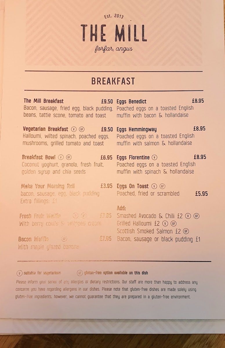The Mill Forfar offers a delightful range of breakfast and other menu options that cater to various tastes. The hearty Mill Breakfast is a classic choice, while the Vegetarian Breakfast offers a lighter, plant-based alternative. For a more unique start to the day, the Breakfast Bowl is a perfect choice. Those with a fondness for eggs can indulge in the elegant Eggs Benedict or the flavorful Eggs Hemingway. The "Up of The Day" adds a seasonal twist to the menu, ensuring there's always something new. For a comforting, traditional dish, Cullen Skink is a popular selection. The Roasted Courgette, Aubergine, and Red Pepper Tante presents a satisfying vegetarian option, while the Deep Fried Brie offers a rich, indulgent treat. A more refined pairing, the Peaches and Serrano Ham, adds a perfect balance of sweet and savory to the offerings. Each dish reflects the restaurant's dedication to quality, with flavorful combinations that are both comforting and creative.